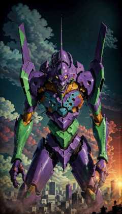 (eva 01), evagod, evangelion mecha, science fiction, looking at viewer, (official art, Best quality, masterpiece:1.2), illustration, high res, beautiful abstract background, Futurism, cyberpunk, intense angle, <lora:EVAIII:0.6>