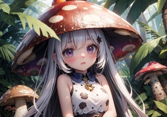 Forest after rain, Amazon rainforest, lots of tropical trees, palm trees, lots of giant mushrooms, lots of poison mushrooms, red and white spotted mushrooms, purple mushrooms, yellow mushrooms, white mushrooms, explosion mushrooms, charm mushrooms, fluorescent mushrooms(monsterification:1.3), (1 giant mushroom_girl, wearing Spotted dress, spotted mushroom hair), (spotted mushroom hat:1.2), (upper body), (cute face), beautiful eyes(detailed light), (extremely delicate and beautiful), volume light, best shadow, flash, Depth of field