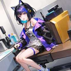 masterpiece, best quality, 1girl,(solo:1.3),standing,official art, simple background, close-up,HibikiHimekawa,short hair,multicolored hair,black hair,purple hair,blue hair,cross hair ornaments,blue eyes,cat ear headphones,