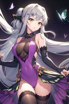 masterpiece,best quality,1girl,(solo:1.2),<lora:Yui(Majsoul)-000008:0.8>,Majsoul,YuiYagi,Yui_dancer,long hair,sliver hair,yellow eyes,standing,upper body,from side,purple dress,butterfly,black thighhighs,detached sleeves,black bodysuit,