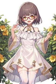 masterpiece,high quality,1girl,(solo:1.2),open mouth,(happy:1.2),(standing),looking at viewer,Hana_wedd,white thighhighs,short hair,brown hair,yellow eyes,bare shoulder,long dress,red frame glasses,, <lora:EMS-4365-EMS:1>