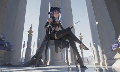 alchemy stars, by void, highres, hassan of serenity \(fate\), assassin \(fate\), dark skin, dark-skinned female, purple hair, purple eyes, breasts, 1girl, short hair, gloves, fingerless gloves, (center opening:1.3), medium breasts, hairband, weapon, navel, bare shoulders, brown hair, stairs, ponytail, black hairband, black gloves, long hair, pillar, knife, leotard, holding, statue, black leotard, sitting, column, kunai
