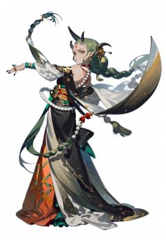 best quality, masterpiece, by reiko, full body, character illustration, highres, best lighting and shadow, stunning color scheme, solo, horns, braid, forehead mark, jewelry, white background, long hair, pointy ears, bead necklace, beads, simple background, necklace, oni horns, looking at viewer, bare shoulders, looking back, facial mark, oni, 1girl, off shoulder, from behind, blonde hair, green eyes, earrings, braided ponytail, very long hair, prayer beads, closed mouth, green hair, sleeveless