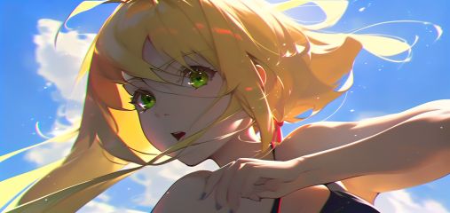 best quality, masterpiece, highres, stunning color, radiant tones, best lighting and shadow, ultra-detailed, amazing illustration, an extremely delicate and beautiful, by wlop, nero claudius (fate), nero claudius (fate, lion, 1girl, breasts, blonde hair, green eyes, cleavage, ahoge, sky, animal on shoulder, day, animal