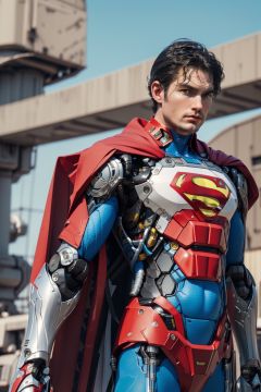 Superman color scheme,(8k, RAW photo, best quality, Masterpiece :1.2), (Realistic, Photo realistic :1.2)(RAW photo)(Very detailed CG unified 8k wallpaper) Detailed and complex, original, high resolution, (1 boy :1.5) Looking at the viewer, upper body, blue stone,, mechanical, Mecha, mechanical, mechanical, Chibi,, Armor, full body, sci-fi, robots, tights