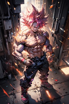 1 boy,((full body:1.2)),(stand),(male focus:1.1),(male muscles:1.2),SAIYA,(looking at viewer),(white eye:1.2),(pectoral),(abdominal muscle),(big muscle),super saiyan,(pink hair:1.2),(urban setting:1.3),