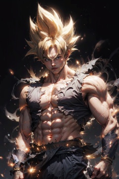 1 boy,(male focus:1.1),(male muscles:1.2),SAIYA,super saiyan,(looking at viewer),super saiyan 1 ,(white eye:1.2),(blond hair:1.1),(pectoral),(abdominal muscle),(big muscle),