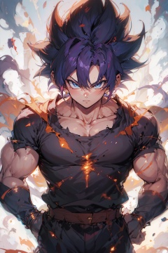 1 boy,(male focus:1.1),(male muscles:1.2),SAIYA,super saiyan,(purple hair:1.2),(looking at viewer),blue eyes,super saiyan 1 <lora:SAIYA_20230713174446-000016:0.9>,