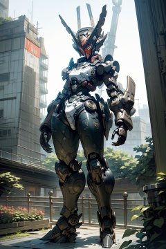 robot mask,QTQI,(giant:1.4),giant mecha,standing on city space,street,(city:1.4),(garden:1.2)(((masterpiece,best quality))),((good structure,Good composition,good atomy)),QTQI,mecha,Bronze ware