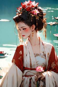 zanhua, Best quality, masterpiece, 1 girl,upper body, holding flower, red flower on head, wearing hanfu, in red and white, looking at viewer, bird, flower, black hair, ((lotus)), solo, hair ornament, water, reflection, daylight, cinematic light,<lora:zanhua_v1:0.9>