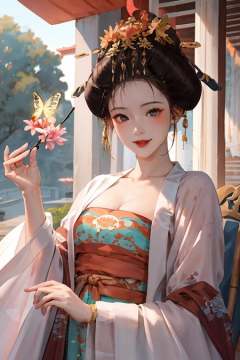 <(cinematic light, finely detailed face)>, ((butterfly)) , Best quality, masterpiece, brilliant colors , 1 girl, black eyes, solo, (looking at viewer), smile, happy expression, dancing with butterfly,zanhua, flower_on_head,, hanfu_tang, holding flower, chinese traditional architecture,((in the garden)), outdoor,<hypernet:dalcefoNocopyV2_dalcefoNocopyV2:0.5> <lora:zanhua_v1:0.9>