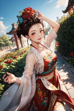 zanhua, red flower on head, ((butterfly)) , Best quality, masterpiece, brilliant colors , 1 girl, black eyes, solo, (looking at viewer), smile, happy expression, dancing with butterfly, red hanfu, holding flower, ((in the garden)), floral background,  outdoor, chinese traditional architecture, <lora:zanhua_v1:0.8>