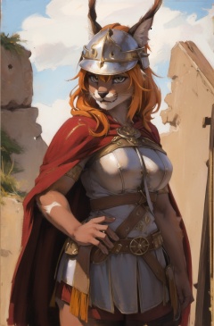 absurdres, highres, ultra detailed, masterpiece, cel shading,africa,cowboy shotfurry girl,caracal,long orange hair,shiny hair,(high detail fur:1.2),solo,,oil painting,traditional medialooking at viewer,female romanarmy warrior with helmet on and red cape <hypernet:furry_kemono:0.3><lora:Caracal:0.7> <lora:ankamaV2:0.3>  <lora:Oilpainting:0.5> <lora:ARWromanarmy:1>