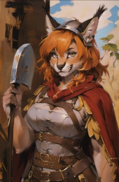 absurdres, highres, ultra detailed, masterpiece, cel shading,africa,cowboy shotfurry girl,caracal,long orange hair,shiny hair,(high detail fur:1.2),solo,,oil painting,traditional medialooking at viewer,female romanarmy warrior with helmet on and red cape,holding war axe <hypernet:furry_kemono:0.5><lora:Caracal:0.7> <lora:ankamaV2:0.3>  <lora:Oilpainting:0.7> <lora:ARWromanarmy:1>