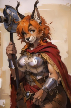 absurdres, highres, ultra detailed, masterpiece, cel shading,flyingfurry girl,caracal,long orange hair,shiny hair,(high detail fur:1.2),solo,,oil painting,traditional medialooking at viewer,female romanarmy warrior with helmet on and red cape,holding hammer <hypernet:furry_kemono:0.5><lora:Caracal:0.7> <lora:ankamaV2:0.3> <lora:Oilpainting:0.7> <lora:ARWromanarmy:1>