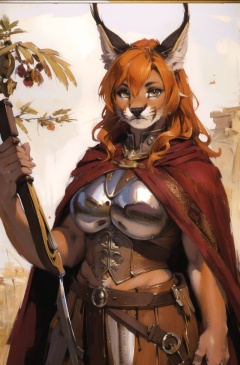 absurdres, highres, ultra detailed, masterpiece, cel shading,africa,cowboy shotfurry girl,caracal,long orange hair,shiny hair,(high detail fur:1.2),solo,,oil painting,traditional medialooking at viewer,female romanarmy warrior with helmet on and red cape,holding hammer <hypernet:furry_kemono:0.5><lora:Caracal:0.7> <lora:ankamaV2:0.3> <lora:Oilpainting:0.7> <lora:ARWromanarmy:1>