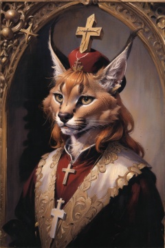 absurdres, highres, ultra detailed, masterpiece, cel shading,churchfurry girl,caracal,long orange hair,shiny hair,(high detail fur:1.2),solo,oil painting,traditional medialooking at viewer,the Pope,cardinal custom,cross,Pope hat,pray<lora:Caracal:0.7>  <lora:Oilpainting:0.7>  <lora:kenkelly:0.3> <lora:add_detail:1>