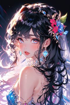 (masterpiece:1.2), best quality,PIXIV,Colorful portraits, 1girl, solo, jewelry, earrings, black hair, looking at viewer, long hair, hair ornament, blush, bare shoulders, looking back, gem, parted lips, blurry, portrait, eyelashes, glint, dress, flower, leaf, bangs, beads, from behind, lips, veil, upper body<lora:Colorful portraits_20230715165729-000018:1>