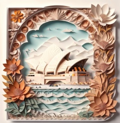 masterpiece, best quality,RAW photo, *subject*, (high detailed skin:1.2), 8k uhd, dslr, soft lighting, high quality, film grain, Fujifilm XT3,regal, high detail, fractal, 3d depth, 3D graphics with simplistic polygon shapes, intricate designs, delicate patterns, shadowbox frame, silhouette, kirigami, scherenschnitte,Sydney Opera House,shell,jianzhi, (cloud:0.8),simple background,depth of field, flower, sky,circle,white background,sea,weave,blue water,boat,<lora:Jz:0.66>