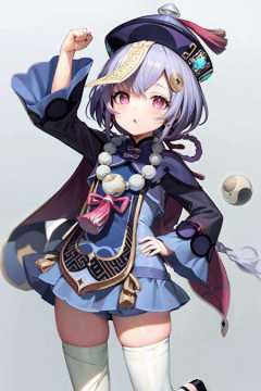 masterpiece, best quality,<lora:qiqi:1>,1girl, qiqi (genshin impact), solo, purple hair, hat, thighhighs, hair ornament, arm up, qing guanmao, white thighhighs, long sleeves, long hair, braid, looking at viewer, purple eyes, full body, bangs, jewelry, beads, bandaged leg, bead necklace, necklace, ofuda, parted lips, wide sleeves, dress, standing, jiangshi, sleeves past wrists, bandages, single braid, black footwear, snowflakes, :o, hand on hip, purple headwear, gradient background, gradient, yin yang, zettai ryouiki, braided ponytail, simple background, coin hair ornament, blue dress, blush, very long hair, shoes, head tilt, cape, sidelocks, hair between eyes, jacket, vision (genshin impact), chinese clothes, cropped jacket, low ponytail