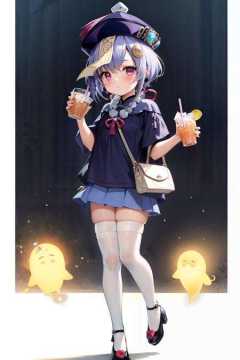 masterpiece, best quality,<lora:qiqi:1>,1girl, qiqi (genshin impact), thighhighs, solo, hat, purple hair, white thighhighs, short sleeves, skirt, full body, hair ornament, braid, black footwear, zettai ryouiki, jiangshi, ofuda, long hair, drinking straw, blue skirt, holding, purple eyes, standing, white background, qing guanmao, alternate costume, looking at viewer, coin hair ornament, single braid, bangs, shirt, simple background, pleated skirt, bag, shoes, cup, braided ponytail, ghost, purple headwear, blush, casual, talisman, drink, sidelocks, miniskirt, closed mouth, holding drink, holding cup, blue headwear, hair between eyes, beads, white shirt, jewelry