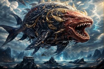 kun,Masterpiece, ultra high resolution, artwork, 3D, CG, Unreal Engine 5, Chinese mythology, red fish occupying the sky with huge body contrast, lateral body, huge fear, long fins, open mouth, sharp teeth, lightning, exquisite details, sparkling sunrise effect, light shadow effect, scenery in the sky, scenery around clouds, bright and rich epic contrast style clock, Inspired by the realistic details in anime and character design, the film background, light yellow foreground, and low angle perspective of 32kextreme create realistic and delicate golden details in the manga., <lora:EMS-8107-EMS:0.6>