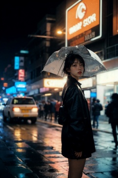 analog style| photograph of woman standing alone in the rain silhouetted by neon lights | Cyberpunk | Night City | Canon EF 50mm f/1.8 STM Lens | 2077 | realistic | hyperrealistic | raytracing | depth of field | full of color | cinematic | highly detailed | rim lighting
