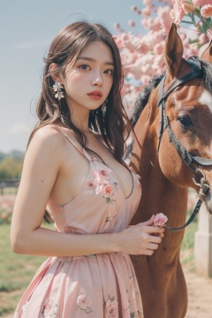 1girl, flower, horse, headdress made of flowers,dress, full of flower,brown hair, realistic, solo, rose, earrings, jewelry, long hair, pink rose, pink flower, hair flower, outdoors, blurry, looking at viewer, pink dress, day, sky, lips, breasts, blurry background, watermark