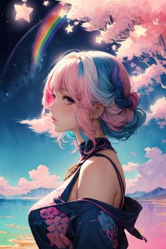 (masterpiece, top quality, best quality,watercolor (medium),official art, beautiful and aesthetic:1.2),(1girl:1.3), (fractal art:1.3),upper body, from side, looking at viewer,patterns,(rainbow color Hair,colorful hair,half blue and half pink hair:1.2),water,liquid, cloud,colorful, starry,stars,