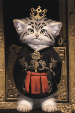 absurdres, highres, ultra detailed, masterpiece, cel shading,indoor,chinese palace,the great wall,furry,short hair,shiny hair,chibi,kitten(high detail fur:1.2),solo,chinese emperor clothes,crown,chibi,oil painting,traditional media,looking at viewer,furry male,Fechin,tusun,pallascat,manul,manulcat,3DMM