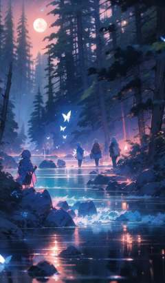 moonriver, night, multiple boys, nature, scenery, rock, multiple girls, fireflies, bug, water, tree, forest, outdoors, sky, bag, butterfly, moon  <lora:moonriver-noise:1>