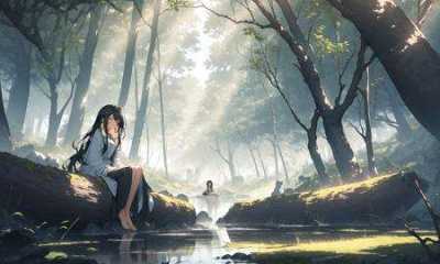 1girl, bare_tree, black_hair, branch, bush, day, earrings, forest, grass, hair_ornament, hairclip, log, long_hair, nature, outdoors, plant, pond, river, rock, scenery, sitting, soaking_feet, solo, sunlight, tree, water<lora:lightV1-000008:1>