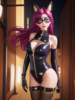 1girl,eye mask,zipper,cityscape,night,single leg pantyhose,fake animal ears,medium hair,looking at viewer, elbow gloves, latex, thigh strap, standing,mature female, leotard, ring,arms behind back,red purple hair, black bodysuit,   <lora:AKEan_20230718135911:0.75>