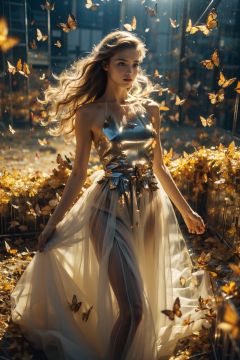 Best quality,masterpiece,ultra high res,(photorealistic:1.4),1girl,die,male perspective,full body,a small number of butterflies,long hair,perfect body proportions,(long dress:1.5),<lora:蝶舞5:0.8>,corn maze,fur trim,rabbit pose,