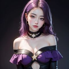 1girl, star eye, blush, perfect illumination, distinct, unreal engine, sidelighting, (bright skin:1.1), ulzzang-6500-v1.1, soft smile, (face focus:1.1), ((dark purple hair)), (simple background), (dark background), (depth of field), bodysuit, close-up,cowgirl outfit,off_shoulder,jewelery