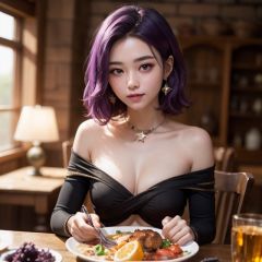 1girl,princess,star eye, blush, perfect illumination, distinct, unreal engine, sidelighting, (bright skin:1.1),soft smile, (face focus:1.1), ((dark purple hair)),(depth of field), bodysuit, close-up,off_shoulder,jewelery,dinner
