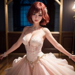 1girl, star eye, blush, perfect illumination, red hair,  blueeyes, unreal engine, sidelighting, detailed face, bangs, bright skin,full_body,jewelery,weddingdress,dance
