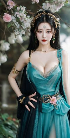 1 Girl, dress, Black hair, solo, Hair accessories, Long hair, Gloves, flowers, branches, Fingerless gloves, Blue dress, Green Dress, Forehead Mark, Jewelry, Belt, whole body, cleavage, full breasts, Baby tender skin,