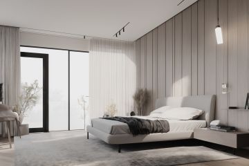 DIA designed bedroom with white latex paint on the ceiling, light grey hard pack on the bed background, dark grey wood flooring, only a little metal and glass, amazing sunlight lighting through the windows, fog, vivid colors, photo grade rendering, realistic style, 8K, high resolution, highly detailed, ray tracing, vray rendering, masterpiece, best quality, visual rendering by Mir. and Brick.   <lora:lwsn-muse:0.9>, (8k, RAW photo, best quality, masterpiece:1.2), (realistic, photo-realistic:1.3)