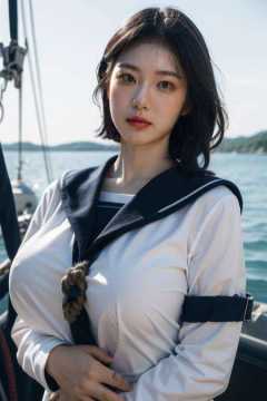 (ultra photorealistic:1.4),extremely high quality high detail color photo,high detailed skin,8k,noble face,Fujifilm X-T5,((pure background :1.2)),(Perfect female body:1.2),(upper body:1.3),1gril,(big breasts:1.2),marine style, nautical stripes, navy blue, white, boat shoes, sailor-inspired clothing, anchor motifs, rope accessories<lora:辛睿恩198:1>