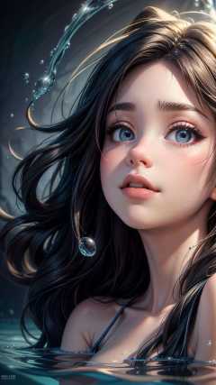 abstract background,(illustration:1),masterpiece,best quality,detailed face and eyes,1 girl,underwater hair physics,air bubbles,light coming through water,reflections,laying in water,split layers of water,school of fish,beauty,