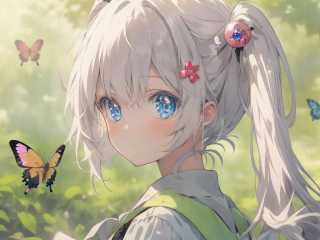 1girl, twintails, bangs, bird, butterfly, blue eyes, blurry, blurry background, blurry foreground, bug, hair ornament