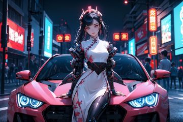 1 girl, solo, sitting on the car, a high-tech sports car, cyberhanfu, long sleeves, chinese_clothes, in pink and white, cyberpunk city, dynamic pose, Headdress, hair ornament, long hair, cyberpunk, a high-tech city, full of machinery and futuristic element, futurism, technology ,daylight<lora:cyberhanfu_20230617014620-000010:0.7>