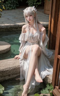 realistic,photorealistic,masterpiece,best quality,1girl, long hair, barefoot, sitting, white hair, solo, dress, hair ornament, water, bare shoulders