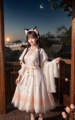 (8k, best quality,high quality clothes, light smile:1.2,bright pupils,sparkling eyes,masterpiece:1.2,tall precision skin,,rich facial texture,open_clothes:1.6),1girl,nipples, breasts, solo,long_hair, black_hair,(spring)(flowers all over the ground),(peach blossom, falling petals,petals,),(White Dress,white sleeves,white shorts,white hairband),(pavilion),(swinging fox tail),fur_trim, animal_ears, fur,(whit_ fur_clothing:1.3),hair_ornament, veil,cat girl,(cloud,MIST,peak,alp,1sunrise,1moon,morning,ship, starry sky,blooming with flowers, reeds,),(full of peach blossoms)