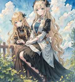 masterpiece,best quality,asterpiece,beautiful,extremely detailed CG unity 8k wallpaper,<lyco:shuicai_littel2:1.5>,1girl,watercolor,Long blonde hair and black dress,Princess,elf,blue sky and white clouds,Outdoor,The warm sunshine,BREAK