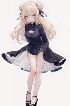 hair ribbon,buns, blonde hair, blue eyes, large breasts,long hair, bangs,looking at viewer, long sleeves, blush, stray hair,smile, open mouth, wink,Simple background china_dress, standing,full_body,arms behind back, leaning forward,bare legs,high heels,loli