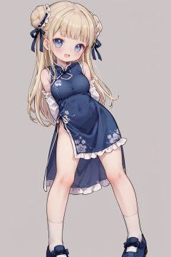 hair ribbon,buns, blonde hair, blue eyes, large breasts,long hair, bangs,looking at viewer, long sleeves, blush, stray hair,smile, open mouth, wink,Simple background china_dress, standing,full_body,arms behind back, leaning forward,bare legs,frill shoes
