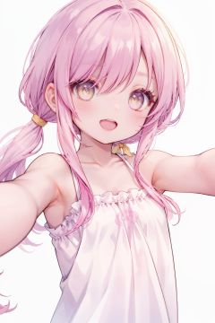 1girl, solo,looking at viewer,collarbone, blush,bare arms, bare shoulders,reaching out,close range, pink hair,yellow eyes,hair over one eye,hair tie,medium hair with long locks, low tied,low ponytail,long locks,solo locks,child,small breasts,bare shoulders,blush,light smile,open mouth, winking, standing,upper body,white background,outstretched arm,
