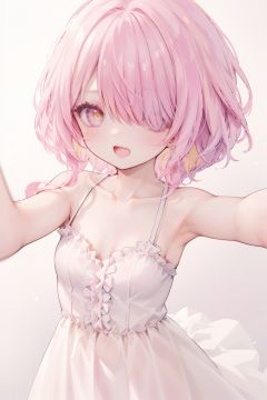 1girl, solo,looking at viewer,collarbone, blush,bare arms, bare shoulders,reaching arm ,close range, pink hair,yellow eyes,hair over one eye,hair tie,medium hair with long locks, low tied,low ponytail,long locks,solo locks,child,small breasts,bare shoulders,happy,blush,light smile,open mouth,standing,upper body,white background,arms reaching out,reaching out,White Slip dress